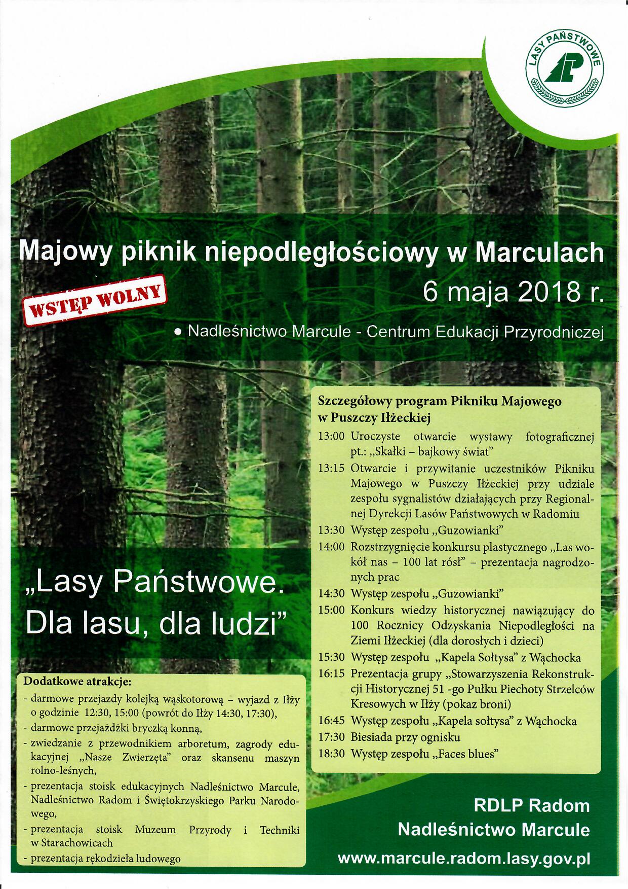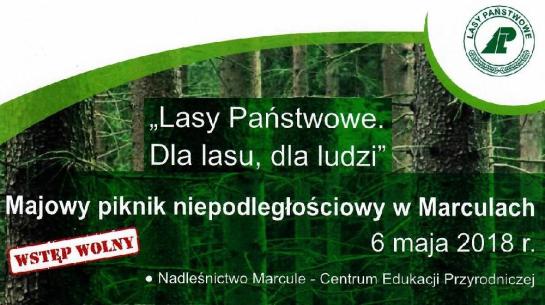 Nadleśnictwo Marcule serdecznie zaprasza na Majowy Piknik Niepodległościowy w Marculach. Gwarantujemy ciekawe spotkania z przyrodą i historią Polski oraz liczne atrakcje. Chętni będą mogli wziąć udział w konkursach z nagrodami.